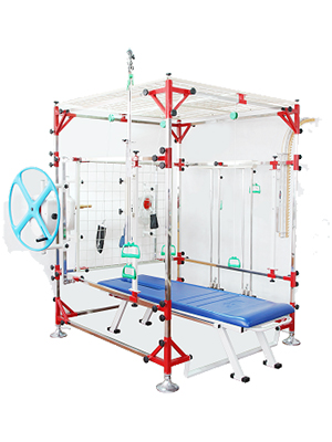 一、多功能訓練器(八件組合)的概述 多功能訓練器(八件組合)傾斜部的上端與彎管部的一端相連接,彎管部的另一端與主架體的中部相連接,主架體的底端置于前底腳上,主架體的頂端連接有彎架體,主架體的前表面設有靠墊,靠墊后表面通過拉銷活動連接有兩個拉臂,調節立柱的傾斜部上通過調節拉銷連接有彈力繩調節座,彈力繩調節座連接有彈力繩組的一端,彈力繩組的另一端穿過彈力繩滑輪座連接有第一鋼絲繩,第三滑輪旁設有第一鋼絲扣,第一鋼絲扣連接有第二鋼絲繩的一端,第二鋼絲繩的另一端依次穿過各滑輪連接有鋼絲扣。 二、多功能訓練器(八件組合)主要功能 前推、高拉(前)、高拉(后)、低拉、蝴蝶夾胸、踢腿、立式后踢、立式提拉、曲臂上拉、曲臂、健腹、雙杠、腿部側向伸展等;可綜合訓練腹、臂、背、胸、腿、臀部等肌肉,塑造形體,增強人體協調性。配有健腹板和雙杠,有更多趣味的鍛煉選擇;